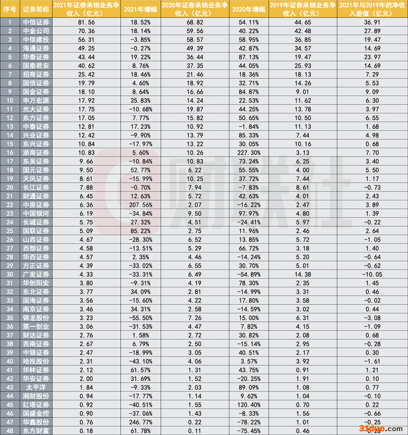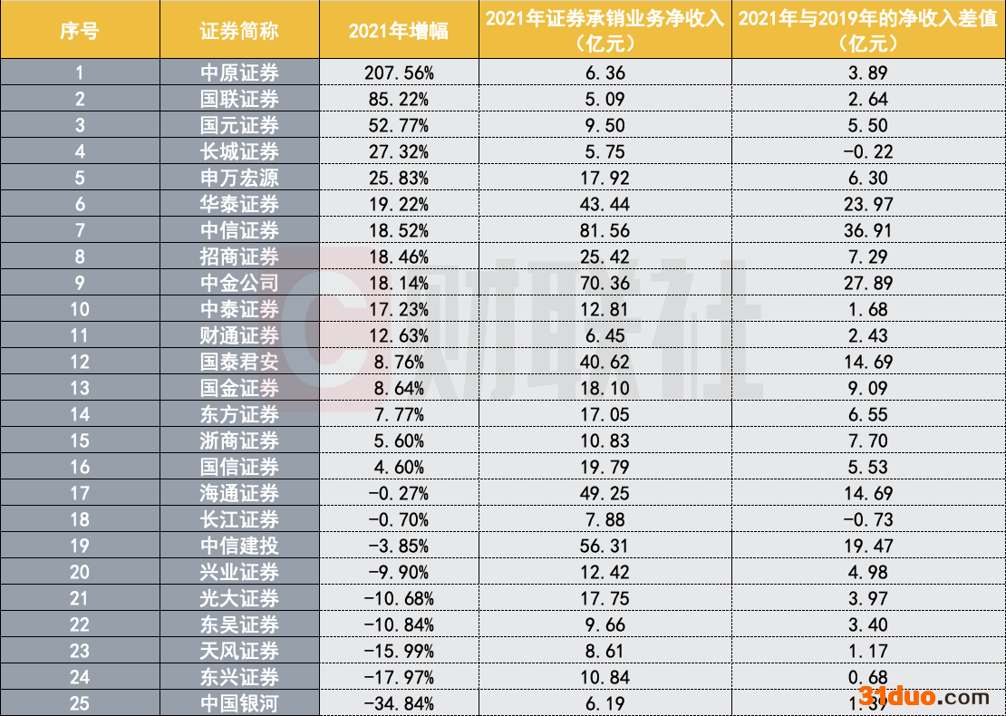 从投行净收入增幅来看,2021年48家上市券商的平均增幅为10.99%,中位数仅为1.97%。其中,仅有25家券商实现正增长,23家负增长,占比接近一半,其中不乏中信建投、海通证券、光大证券、兴业证券等投行。