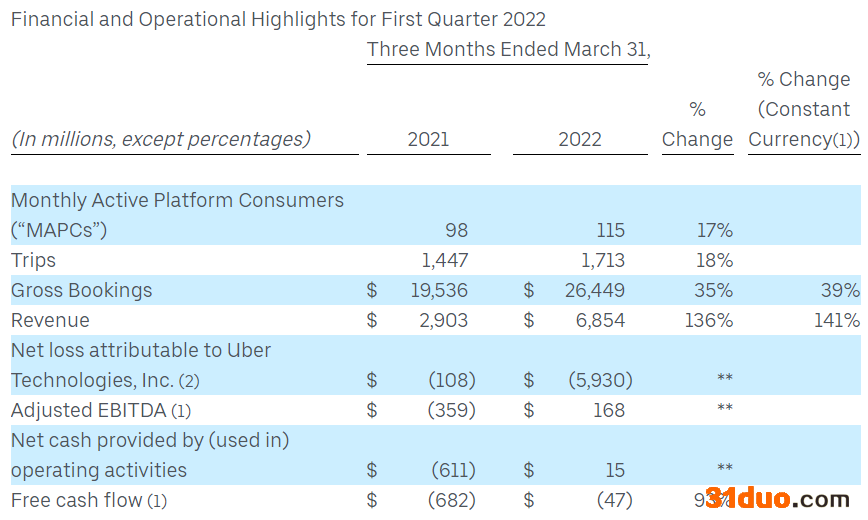 该公司表示,在截至3月份的三个月中,收入同比增长一倍多,至68.5亿美元,高于市场预期的60.9亿美元。当季收入增长的另一个原因是,持续一年的司机短缺令打车价格高企。