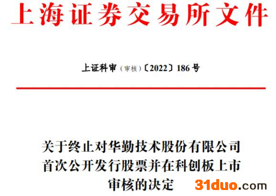 2022年4月29日,华勤技术和保荐人中国国际金融股份有限公司分别向上交所提交了《华勤技术股份有限公司关于撤回首次公开发行股票并在科创板上市申请文件的申请》(华勤证字[2022]第02号)和《中国国际金融股份有限公司关于撤回华勤技术股份有限公司首次公开发行股票并在科创板上市申请文件的申请》(中金证交[2022]0079号),申请撤回申请文件。根据《上海证券交易所科创板股票发行上市审核规则》第六十七条的有关规定,上交所决定终止对华勤技术首次公开发行股票并在科创板上市的审核。