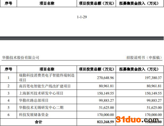 华勤技术原拟公开发行股份数量不超过8888.00万股,占发行后总股本的比例不低于10%,不超过12%。华勤技术原拟募集资金75.00亿元,计划分别用于瑞勤科技消费类电子智能终端制造项目、南昌笔电智能生产线改扩建项目、上海新兴技术研发中心项目、华勤丝路总部项目、华勤技术无锡研发中心二期、科技发展储备资金。