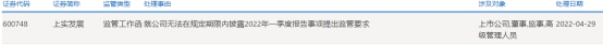 中国经济网北京5月5日讯 上交所于4月29日向上实发展(600748.SH)下发监管工作函,处理事由为就公司无法在规定期限内披露2022年一季度报告事项提出监管要求,涉及对象为上市公司,董事,监事,高级管理人员。