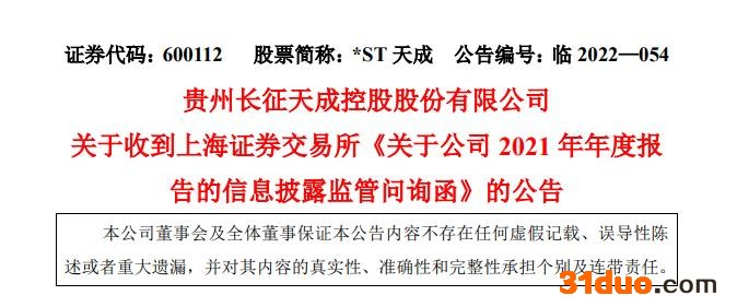 5月4日,*ST天成收到上交所上市公司管理二部发出的《关于公司2021年年度报告的信息披露监管问询函》,质疑公司2021年不当审计意见规避公司退市。