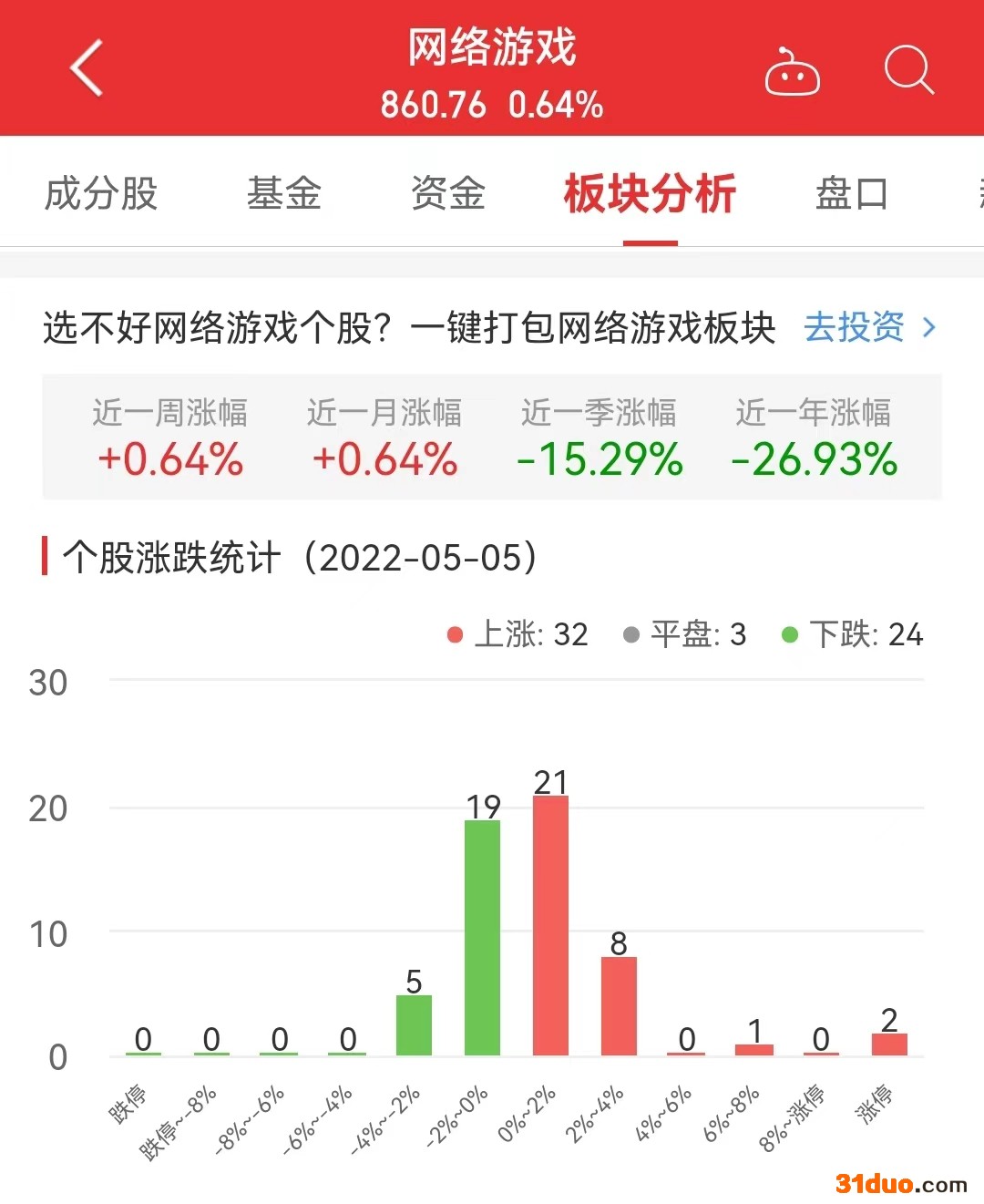 中国经济网北京5月5日讯 今日,网络游戏板块整体涨幅0.64%,其中32只股票上涨,3只股票平盘,24只股票下跌。