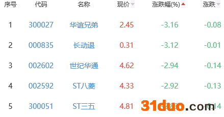 华谊兄弟、长动退、 世纪华通、ST八菱、ST三五位列涨幅榜后五位,涨幅分别为-3.16%、-3.12%、-2.94%、-2.92%、-2.83%。