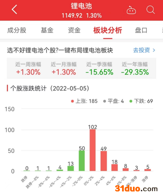 中国经济网北京5月5日讯 今日,锂电池板块整体涨幅1.30%,其中185只股票上涨,4只股票平盘,69只股票下跌。