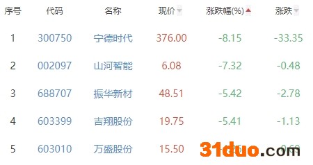 宁德时代、山河智能、振华新材、吉翔股份、万盛股份位列涨幅榜后五位,涨幅分别为-8.15%、-7.32%、-5.42%、-5.41%、-4.26%。