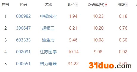 其中,中银绒业、超频三、迪生力、江苏国泰、格力电器位列板块涨幅前五位,涨幅分别为10.23%、10.20%、10.08%、9.98%、9.64%。