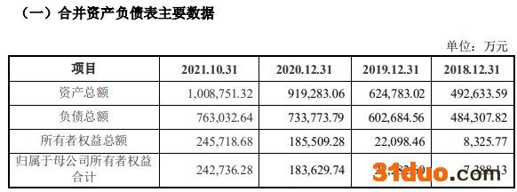 截至2018年末、2019年末、2020年末、2021年10月31日,润泽科技资产总额分别为492,633.59万元、624,783.02万元、919,283.06万元、1,008,751.32万元,负债总额分别为484,307.82万元、602,684.56万元、733,773.79万元、763,032.64万元。标的公司各期末资产负债率(合并)分别为98.31%、96.46%、79.82%和75.64%。