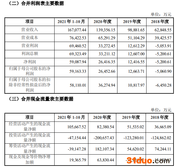 2018年-2020年及2021年1-10月,润泽科技营业收入分别为62,848.55万元、98,881.65万元、139,356.15万元、167,077.44万元,归属于母公司股东的净利润分别为-5,060.90万元、12,663.71万元、26,452.66万元、59,163.33万元,经营活动产生的现金流量净额分别为36,665.09万元、51,535.02万元、82,380.54万元、105,667.52万元。