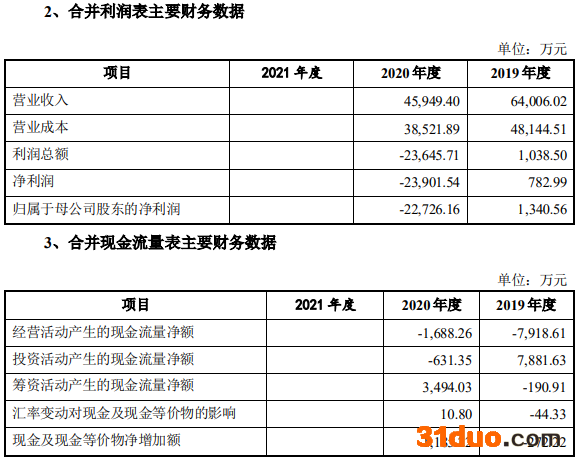 2019年、2020年,普丽盛营业收入分别为64,006.02万元、45,949.40万元;归属于母公司股东的净利润分别为1,340.56万元、-22,726.16万元;经营活动产生的现金流量净额分别为-7,918.61万元、-1,688.26万元。