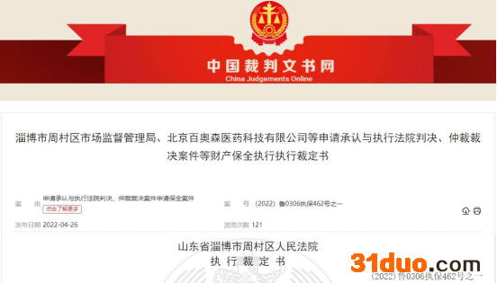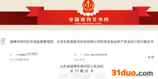 山东省淄博市周村区人民法院执行裁定书((2022)鲁0306执保462号)显示,申请人淄博市周村区市场监督管理局在查处北京百奥森医药科技有限公司传销一案,法院于2022年4月19日作出(2022)鲁0306财保7号行政裁定书,裁定如下:冻结被申请人北京百奥森医药科技有限公司、北京康目医药科技有限公司、北京康目医药科技有限公司河南分公司、刘园园、孟跃辉、刘冬洋、程俊芳、刘洁在各银行账户内的存款1500万元;如无存款或存款不足,即查封或扣押其相应价值的财产。经审查,依照《中华人民共和国民事诉讼法》第一百零三条、第一百零五条、第一百零六条之规定,裁定冻结被申请人北京百奥森医药科技有限公司、北京康目医药科技有限公司、北京康目医药科技有限公司河南分公司、刘园园、孟跃辉、刘冬洋、程俊芳、刘洁在各银行账户内的存款1500万元;如无存款或存款不足,即查封或扣押其相应价值的财产。本裁定书立即执行。