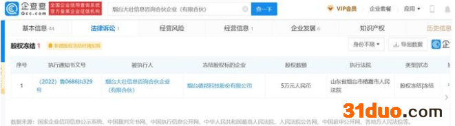 企查查披露信息显示,烟台德邦科技股份有限公司(简称“德邦科技”)近日发生股权冻结事项,烟台大壮信息咨询合伙企业(简称“大壮信息”)持有该公司相当于5万元金额的股权被冻结,执行法院是山东省栖霞市人民法院。