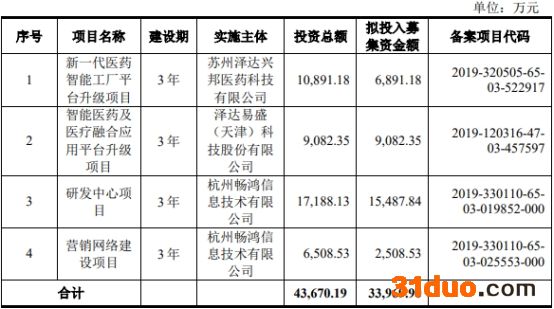 泽达易盛于2020年6月16日披露的招股说明书显示,公司拟募集资金3.40亿元,分别用于新一代医药智能工厂平台升级项目、智能医药及医疗融合应用平台升级项目、研发中心项目、营销网络建设项目。