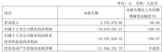 今年一季度,公司营业收入335.59万元,同比减少90.68%;归属于上市公司股东的净利润-1901.93万元,同比减少298.64 %;归属于上市公司股东的扣除非经常性损益的净利润-1949.78万元,同比减少348.07%;经营活动产生的现金流量净额-2193.64万元,同比增长84.36%。