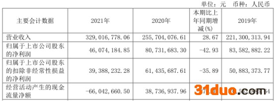 泽达易盛近日发布了2021年年度报告和2022年第一季度报告。去年,公司营业收入3.29亿元,同比增长28.67%;归属于上市公司股东的净利润4607.42万元,同比减少42.93%;归属于上市公司股东的扣除非经常性损益的净利润3938.82万元,同比减少35.89%;经营活动产生的现金流量净额-6604.27万元,同比减少270.49%。