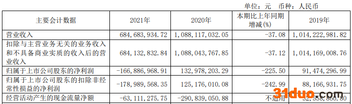 中国经济网北京5月5日讯 南新制药(688189.SH)近日披露的2021年年报显示,公司去年净利亏损。去年,公司实现营业收入6.85亿元,同比减少37.08%;实现归属于上市公司股东的净利润-1.67亿元,上年同期为1.33亿元;实现归属于上市公司股东扣除非经常性损益的净利润-1.79亿元,上年同期为1.25亿元;经营活动产生的现金流量净额为-6311.13万元,上年同期为-2.91亿元。