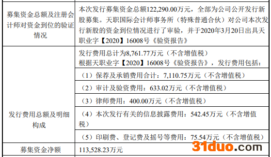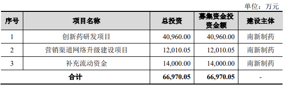 南新制药首次公开发行新股3500万股,募集资金总额为12.23亿元,募集资金净额为11.35亿元,比原拟募集资金多4.66亿元。南新制药2020年3月20日招股书显示,公司原拟募集资金6.70亿元,分别用于创新药研发项目、营销渠道网络升级建设项目、补充流动资金。