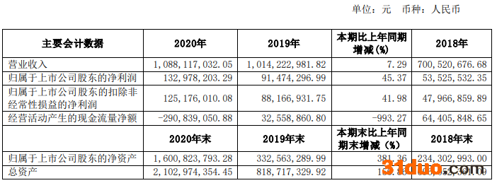 上市首年,南新制药业绩向上,但经营现金净额转为负。南新制药2020年实现营业收入10.88亿元,同比增长7.29%;实现归属于上市公司股东的净利润1.33亿元,同比增长45.37%;实现归属于上市公司股东的扣非净利润1.25亿元,同比增长41.98%;经营活动产生的现金流量净额为-2.91亿元,上年同期为3255.89万元。