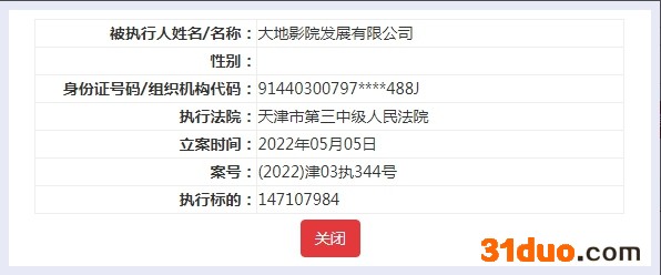 具体看,2022年5月5日,大地影院被蚌埠市蚌山区人民法院强制执行101.57万元,案号为(2022)皖0303执1628号;同日,大地影院被天津市第三中级人民法院强制执行1.47亿元,案号为(2022)津03执344号。