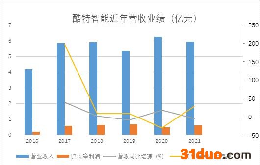 酷特智能2021年在营收下降的同时,归母净利润实现近30%的增长,一方面由于疫情影响,导致同比的2020年净利润缩水;另一方面由于公司业务调整,高利润的定制服装回归主营业务。