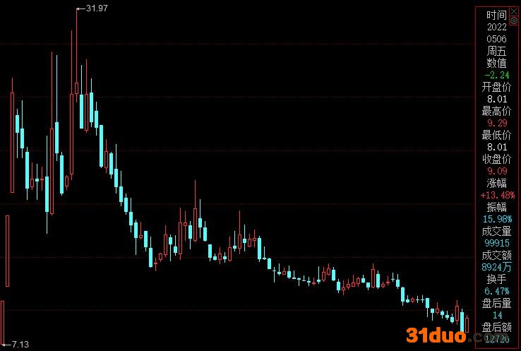 酷特智能上市后除第一天上涨44%,其后又收获11连板,7月23日收盘价24.43元,较发行价5.94元上涨了逾300%。随后在回调震荡中再次发力,于10月21日创下31.97的历史高位,不过却也成为漫长下行趋势的开始。在年报公布后,4月27日刷新年内新低7.39元,截止5月6日收盘,股价报收于9.09元,有所回升。