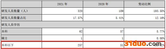 但从上图人员构成上看,增加的研发人员主要以“本科以下”学历为主,虽然整体数量大幅增加,但其中低学历人员占比达80%。