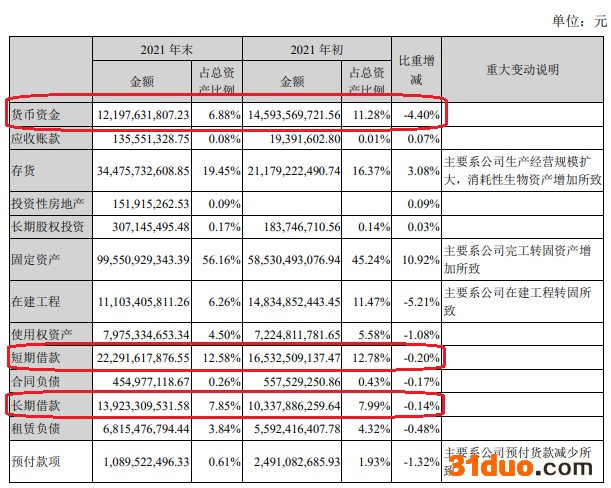 2021年末,牧原股份货币资金余额121.98亿元,占总资产6.88%;短期借款222.92亿元,占总资产12.58%;长期借款139.23亿元,占总资产7.85%。
