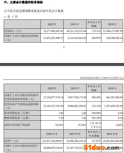 2020年,牧原股份实现营业收入562.77亿元,同比增长178.31%;归属于上市公司股东的净利润274.51亿元,同比增长348.97%;归属于上市公司股东的扣除非经常性损益的净利润273.27亿元,同比增长360.24%;经营活动产生的现金流量净额为231.86亿元,同比增长132.12%。