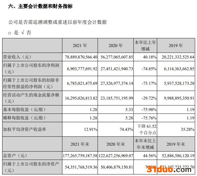 中国经济网北京5月6日讯 4月30日,牧原股份(002714.SZ)发布2021年年度报告。2021年,牧原股份实现营业收入788.90亿元,同比增长40.18%;归属于上市公司股东的净利润69.04亿元,同比下滑74.85%;归属于上市公司股东的扣除非经常性损益的净利润67.85亿元,同比下滑75.17%;经营活动产生的现金流量净额为162.95亿元,同比下滑29.72%。