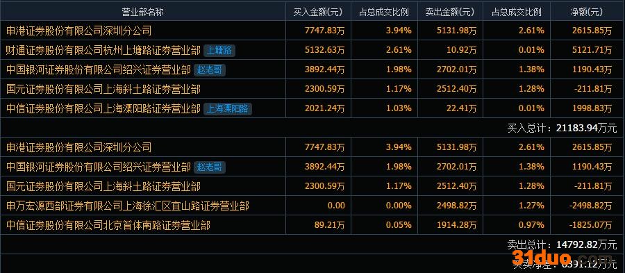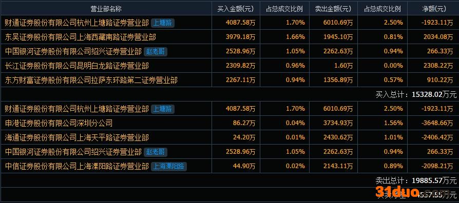 因连续三个交易日内,涨幅偏离值累计达20%,盘后龙虎榜数据显示,游资上塘路(财通证券(601108)杭州上塘路证券营业部)、赵老哥(中国银河(601881)证券绍兴证券营业部)、上海溧阳路(中信证券(600030)上海溧阳路证券营业部)出现在买卖金额最大的前5名之列。游资赵老哥净买入266.33万元,上塘路、上海溧阳路分别净卖出1923.11万元、2098.21万元。