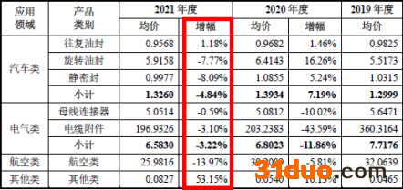 公司其他类产品主要包括O 形圈、异形密封件、密封条等橡胶制品,以及核辐射防护产品等,主要应用于石油、医疗、通用机械、水暖卫浴、核电站等领域。公司指出,2019年-2020年公司其他类产品规模相对稳定,2021年核防护和其他橡胶件产品收入增加带来收入大幅增长,但这种增长主要缘于价格的大幅提升,其销售量只增长了3.84%。