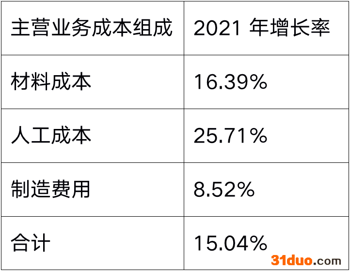 2021年公司原材料成本基本都有不小的涨幅,导致盛帮股份主要原材料采购金额提升41.45%,达到1.03亿元;采购总额提升27.31%,达到1.31亿元。采购金额提高了这么多,为什么材料成本只提高了16.39%?