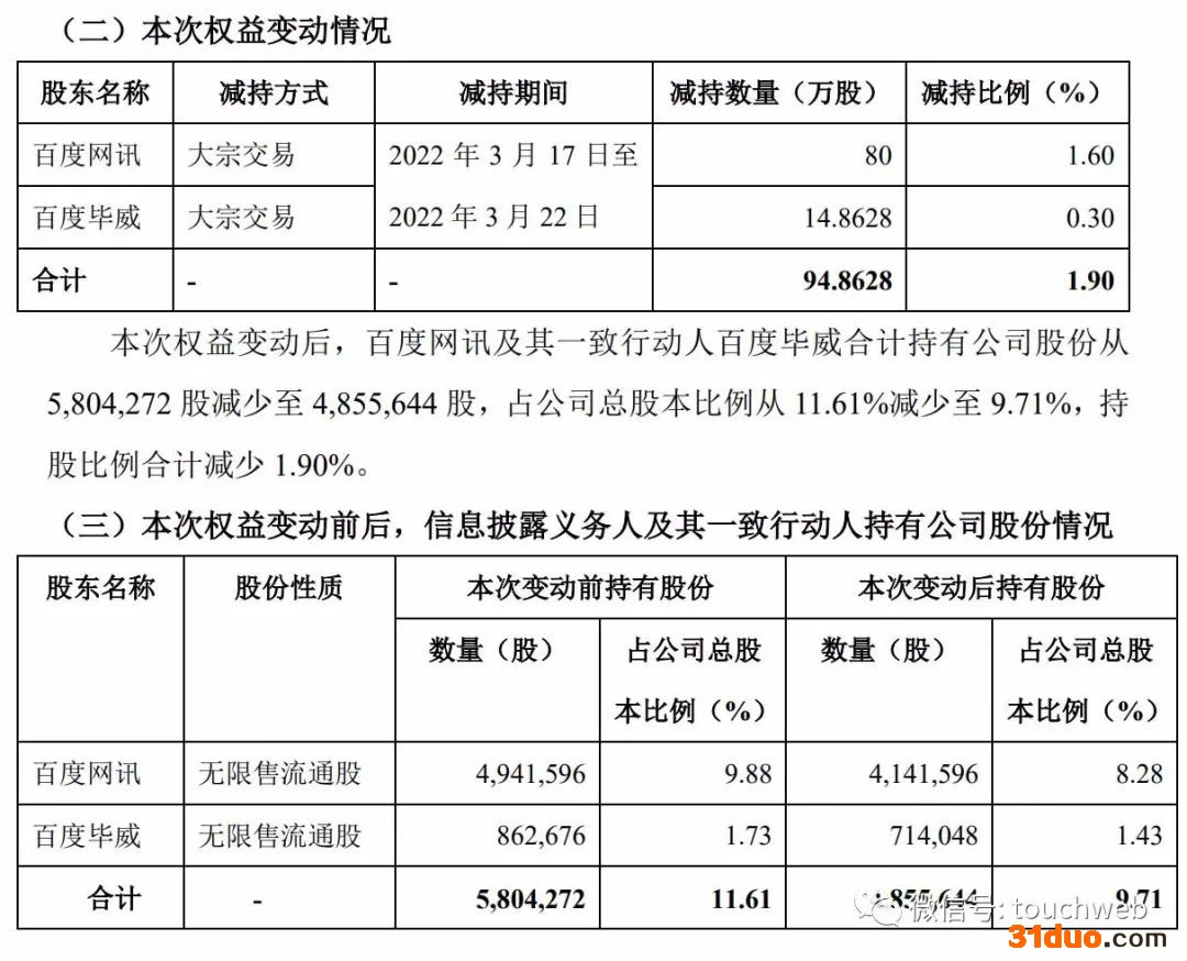 百度网讯和百度毕威为一致行动人,合计持有公司股份从5,804,272股减少至 4,855,644 股,占公司总股本的比例从11.61%减少至 9.71%。
