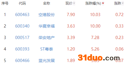 其中,空港股份、华夏幸福、荣安地产、ST粤泰和蓝光发展列板块涨幅榜前五位,涨幅分别为10.03%、10.00%、7.28%、5.26%和3.85%。