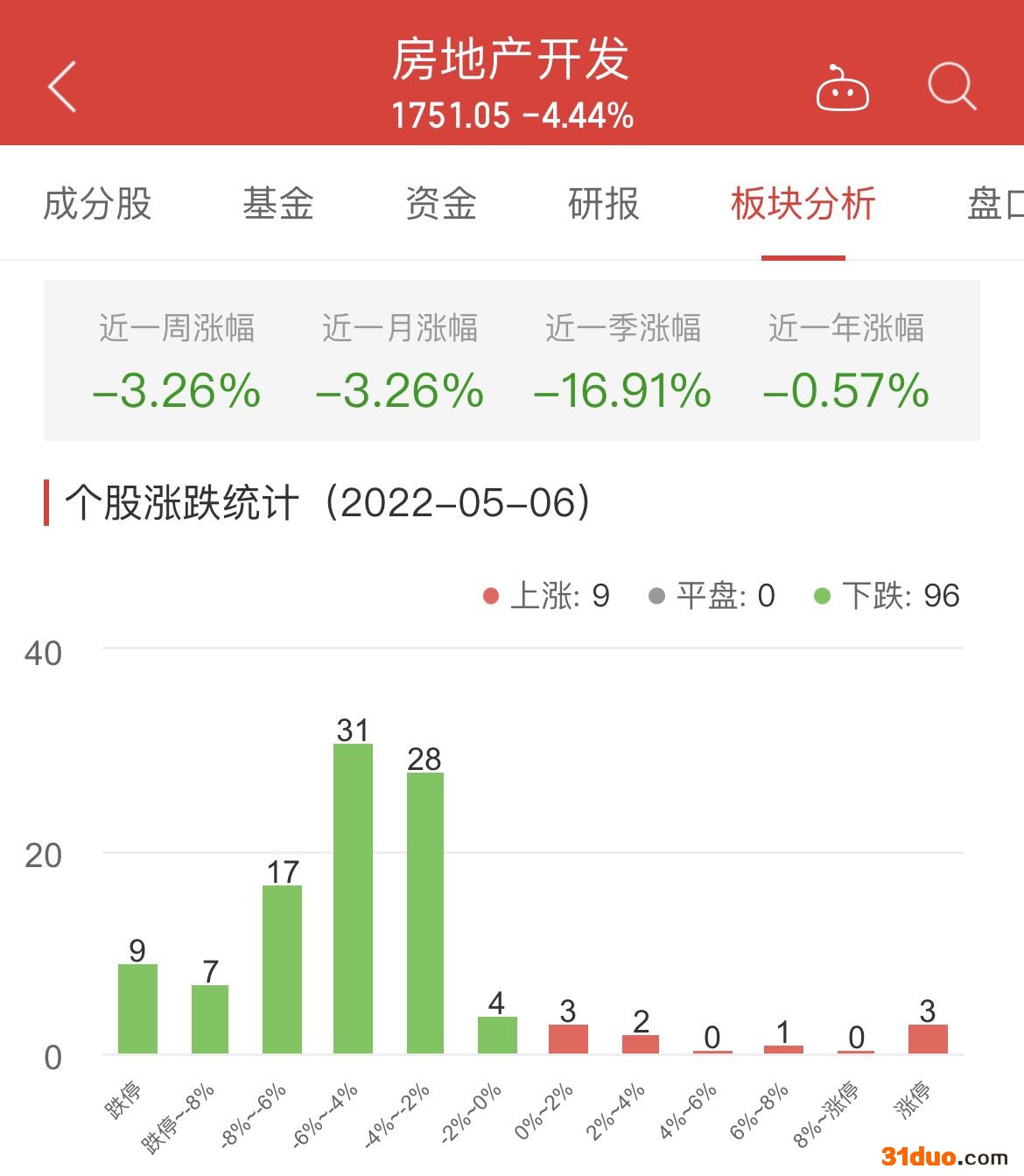 中国经济网北京5月6日讯 今日,房地产开发板块整体跌幅4.44%,其中9只股票上涨,0只股票平盘,96只股票下跌。