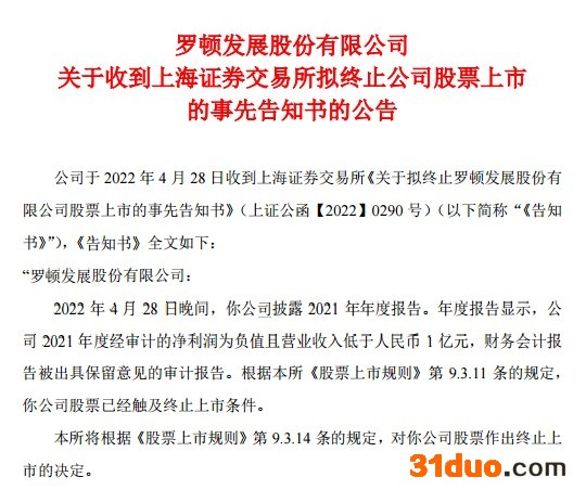 告知书中表示,2022年4月28日晚间,罗顿发展披露2021年年度报告。年度报告显示,公司2021年度经审计的净利润为负值且营业收入低于人民币1亿元,财务会计报告被出具保留意见的审计报告。根据本所《股票上市规则》第9.3.11条的规定,公司股票已经触及终止上市条件。上交所所将根据《股票上市规则》第 9.3.14 条的规定,对公司股票作出终止上市的决定。
