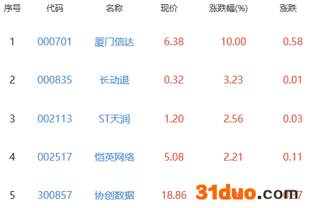 其中,厦门信达、长动退、ST天润、恺英网络、协创数据位列板块涨幅前五位,涨幅分别为10.00%、3.23%、2.56%、2.21%、2.00%。