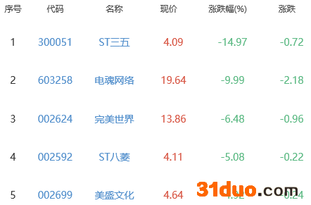 ST三五、电魂网络、完美世界、ST八菱、美盛文化位列涨幅榜后五位,涨幅分别为-14.97%、-9.99%、-6.48%、-5.08%、-4.92%。