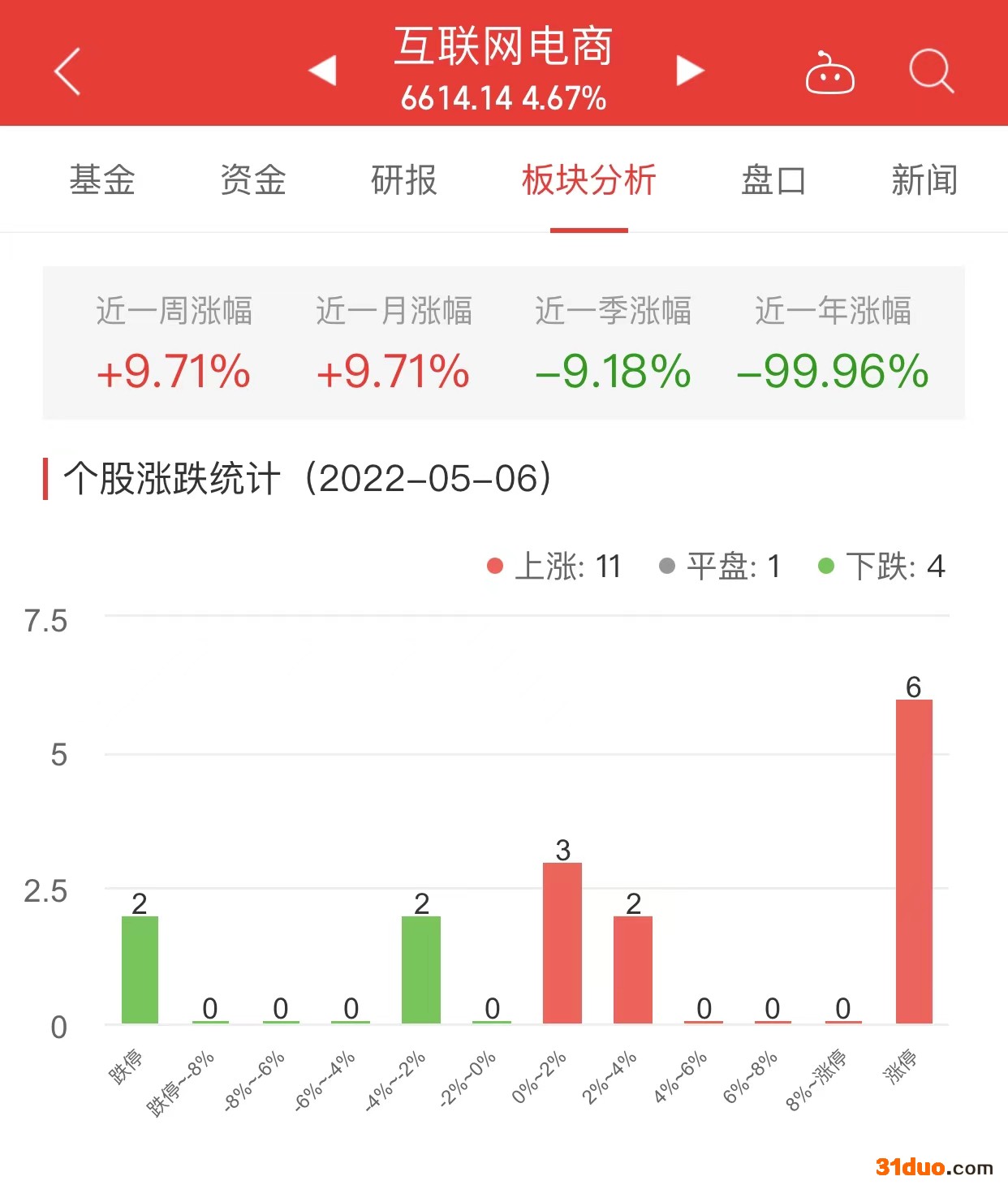 中国经济网北京5月6日讯 今日,互联网电商板块整体涨幅4.67%,其中11只股票上涨,1只股票平盘,4只股票下跌。