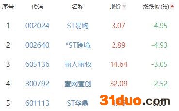 ST易购、*ST跨境、丽人丽妆、壹网壹创、ST华鼎位列涨幅榜后五位,涨幅分别为-4.95%、-4.93%、-3.05%、-2.52%、0.00%。