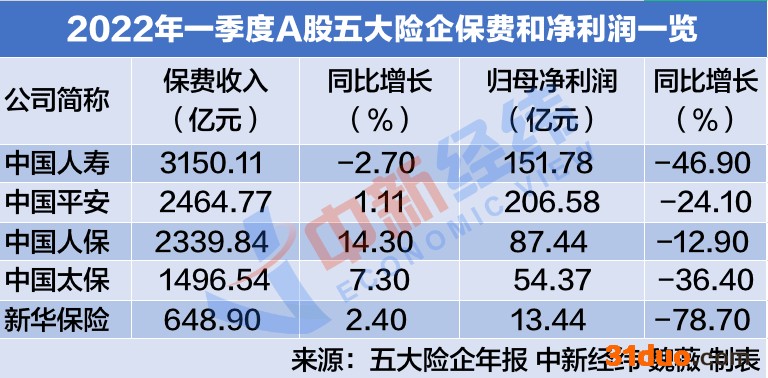 尽管五大险企保费收入总体上依然保持正增长,但净利润增速均出现双位数的下滑。数据显示,中国平安、中国人寿、中国人保、中国太保、新华保险一季度归母净利润分别为206.58亿元、151.78亿元、87.44亿元、54.37亿元和13.44亿元,同比下降24.10%、46.90%、12.90%、36.40%和78.70%