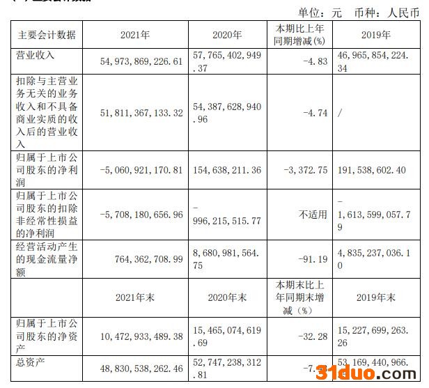 中新经纬5月6日电 近日,福田汽车2021年年报及2022年一季报,公司2021年度实现营业收入549.74亿元,同比下降4.83%。归属于上市公司股东的净亏损50.61亿元,同比由盈转亏。归属于上市公司股东的扣除非经常性损益的净亏损57.08亿元,亏损同比扩大。