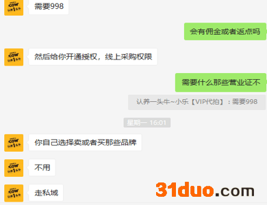 该卖家告诉搜狐财经,其并非官方内部人员,因品牌内购所以价格优惠,产品都是厂家仓库直达;且该商家称,要想加盟需交998元的加盟费,加盟后开通授权并获得线上采购权限,加盟费涉及2000多个品牌,并非仅有“认养一头牛”。