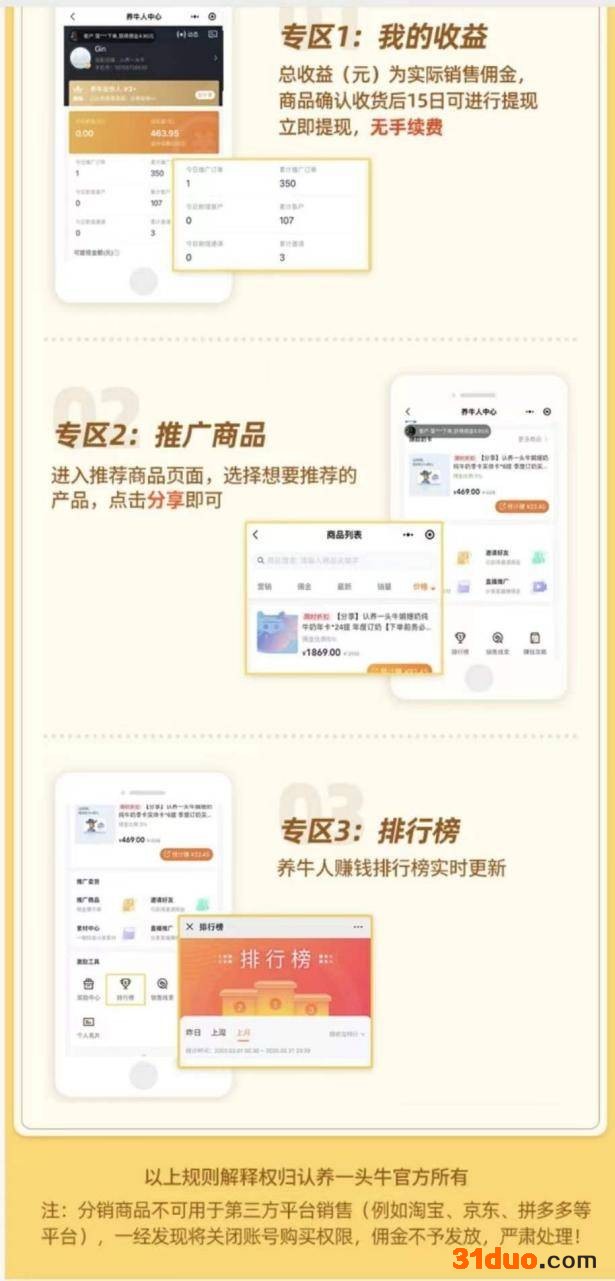 消费者购买指定商品可申请成为初级分销员“养牛红人”;自购及推广指定商品销售累计高于2000元可以升级为“养牛达人”,自购及推广指定商品销售累计高于5000元可升级为 “养牛合伙人”;销售级别越高得到的佣金返利就越多,一般在5%-10%之间。