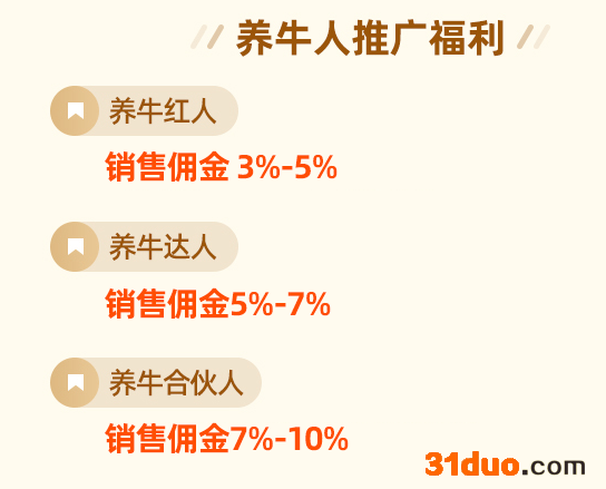 “养牛人计划”的晋升分为三级:养牛红人、养牛达人和养牛合伙人,最高能拿到10%的佣金。