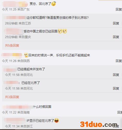 有网友提问,“什么时候回国”,其他网友指出,“IP显示已经在北京了”。对此,还有网友认为,“原来贾跃亭的微博不是本人在管理,就是找个北京的小弟在发”。