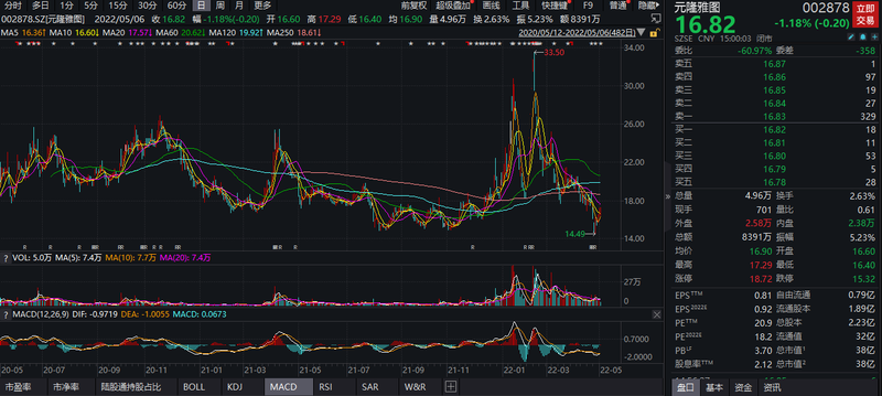 与此同时,2021年受益于冬奥会、元宇宙等多种因素,元隆雅图的股价更是创下了历史新高。由于去年元宇宙概念兴起,公司股价一度从年中最低14.78元翻倍达30.75元,但市场激情褪去后,仅两周其股价就跌去了4成;随后2022年初的冬奥期间,头顶“冰墩墩第一股”,元隆雅图6天之内股价坐火箭般升至33.5元,不过截至5月6日,公司股价已跌至16.82元,接近“腰斩”。(蓝鲸上市公司 王晓楠 wangxiaonan@lanjinger.com)![]()