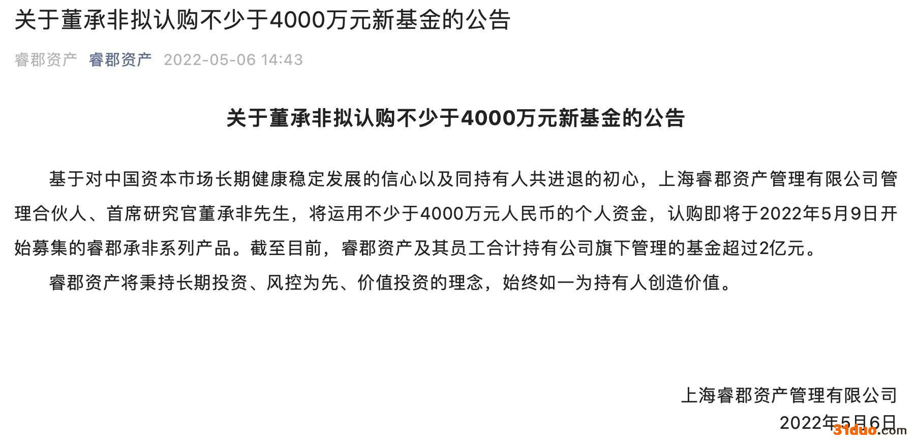 5月6日下午,知名私募睿郡资产宣布,董承非拟认购不少于4000万元新基金。