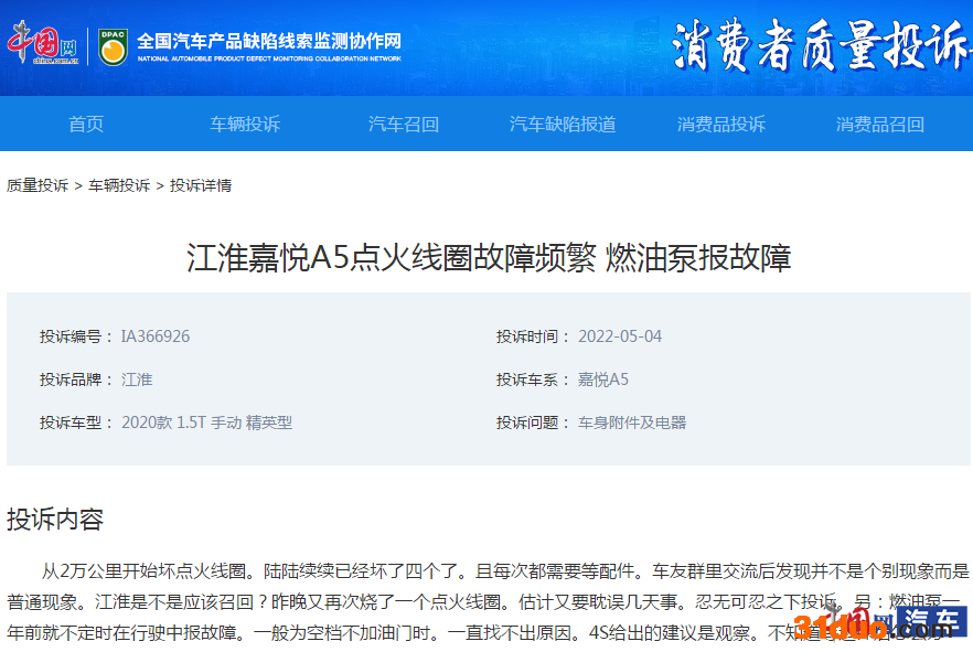 中国网汽车5月7日讯 中国网汽车质量投诉平台近日接到了一位江淮嘉悦A5车主投诉表示,自己的车从2万公里开始点火线圈就出现问题,陆陆续续已经更换了4个,且每次都需要等配件。对此,投诉车主陈先生颇感无奈。