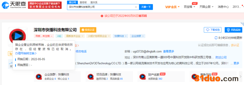 蓝鲸TMT频道5月7日讯,天眼查App显示,近日,深圳市快播科技有限公司经营状态变更为“吊销,未注销”。